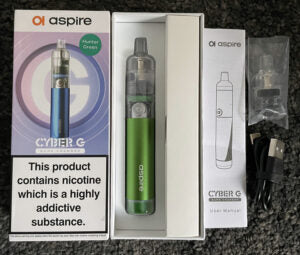 Aspire’s Cyber G pod system comes in a cardboard box with a card slide-off outer sleeve. On the front of the sleeve has printed Aspire branding with an embossed Cyber G picture in front of a ‘G’ coloured panel. Underneath is the printed ‘Cyber G’ title with the slogan ‘Game Changer’. At the bottom is a large printed Nicotine warning as part of TPD regulations on vaping products. Also stuck on the front is a little label displaying the colour of the device inside. This review has the ‘Hunter Green’ colour.