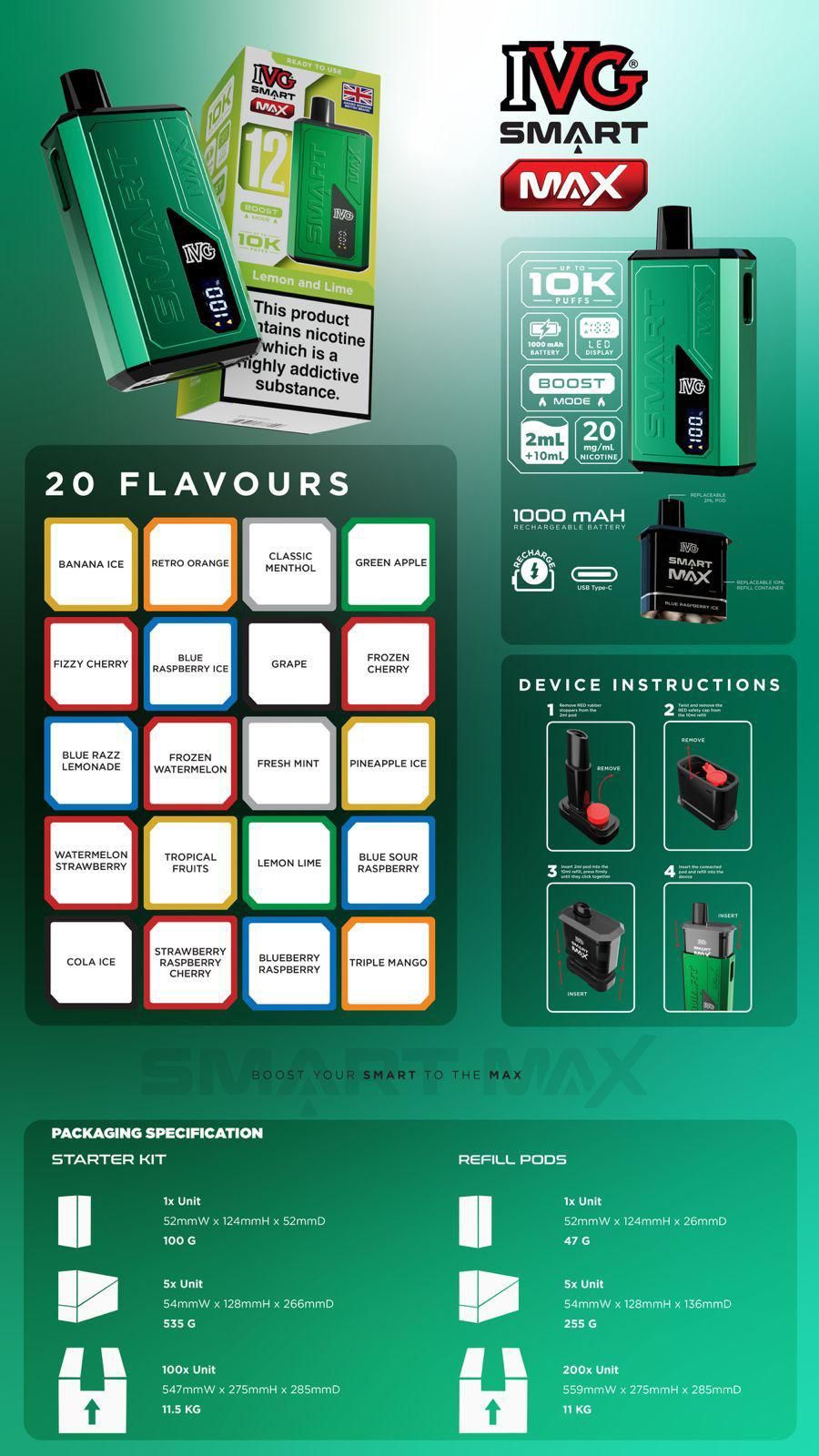 Perfect for those who want premium performance, portability, and simplicity, the IVG Smart Max Prefilled Kit is your go-to companion for all-day vaping.